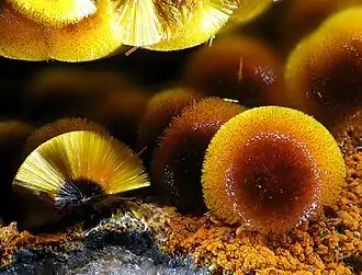 Cacoxenite is an iron aluminium phosphate mineral[5] with formula: Fe3+24Al(PO4)17O6(OH)12·17(H2O).[4] Cacoxenite is associated with iron ores.[6] The name comes from the Greek κăκός for "bad" or "evil" and ξένος for "guest" because the phosphorus content of cacoxenite lessens the quality of iron smelted from ore containing it.[5][7]