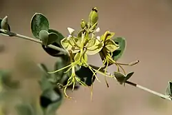 Cadaba farinosa is a usually much branched shrub, mostly 2–3 m (7–10 ft) high, but under favorable circumstances a shrub of 5 m (16 ft) or a tree up to 8 m (26 ft). It has a smooth, reddish brown bark, while young branches appear powdery due to scales or short spreading hairs. The simple and entire leaves are alternate set along the branches, and have narrow, persistent stipules of up to 1½ mm (0.06 in) long, at both sides of an up to 3 mm (0.12 in) long leaf stalk, which carries an oblong or elliptical leaf blade of 5–50 mm (0.20–1.97 in) long and 3–30 mm (0.12–1.18 in) wide, rounded or pointed with a short stiff tip. When young, the leaves appear powdery, but they become gradually hairless. The central vein that branches feather-like into four to five pairs of side veins. The bilaterally symmetric flowers are arranged individually or with a few together in small inflorescences at the tip of the side branches. The flowers have both stamens and a pistel. Each sits on a 5–15 mm (0.20–0.59 in) long flower stalk, has four, somewhat unequal, elliptical sepals that fall after flowering. The outer sepals are 5–14 mm (0.20–0.55 in) long, concave particularly near the tip, that appears pointed because the margins are folded against each other. The inner sepals are almost flat and have a stump tip. The four petals, which fall earlier than the sepals, are approximately 12 mm (0.47 in) long, and consist of a linear, up-curved claw of 6–7 mm (0.24–0.28 in) long, that gradually passes into a wider, creamy, yellowish or dirty pink colored, oblanceolate 4–5 mm (0.16–0.20 in) long blade. The base of the (four or) five stamens and the pistol have merged into a horizontally oriented 4–5 mm long androgynophore, with the free upper parts of the filaments 1–2 cm (0.39–0.79 in) long and carrying 3½ mm (0.14 in) long, very quickly falling anthers. At the base of the androgynophore, there is at a right angle an upwardly directed tube-shaped appendage of 6–7 mm (0.24–0.28 in) long, colored like the petals. The ovary, that contains one cavity, sits on a stalk on top of the androgynophore (called gynophore) and has a cylinder shape. After ferilisation, this develops into a powdery cylindrical capsule of 2–4 cm (0.79–1.57 in) long and about 3 mm (0.12 in) in diameter, with many seeds and slight constricted between these, which open with two valves from the base when ripe. Individual seeds are 2½–3 mm (0.10–0.12 in), rounded to kidney-shaped, and are embedded in an orange-red pulp. The number of chromosomes is thirty two (2n=32).[1][2][3][4]