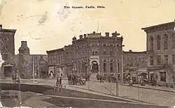 Cadiz was founded in 1803 at the junction of westward roads from Pittsburgh and Washington, Pennsylvania, and named after Cádiz, Spain. The town became the county seat of newly formed Harrison County in 1813.[8] By 1840, Cadiz had 1,028 residents; by 1846, the town had four churches and 21 stores.[9][10] The Steubenville and Indiana Railroad, a predecessor of the Pennsylvania Railroad, opened to Cadiz June 11, 1854.[11]