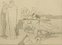 However, after Alichino assures that if the shade does escape then his wings would be fast enough to catch up with him, Cagnazzo is the first to move away from the shore and hide as asked by the damned. This is a subtle psychological detail, that is, the one who was the most opposed becomes the first to carry out an order, and can be interpreted as evidence of Cagnazzo's conviction, which changed opposition to zeal. But it can also be an allusion to Cagnazzo's disillusionment, as if he implied that the sooner the antics end, the better off everyone would be.