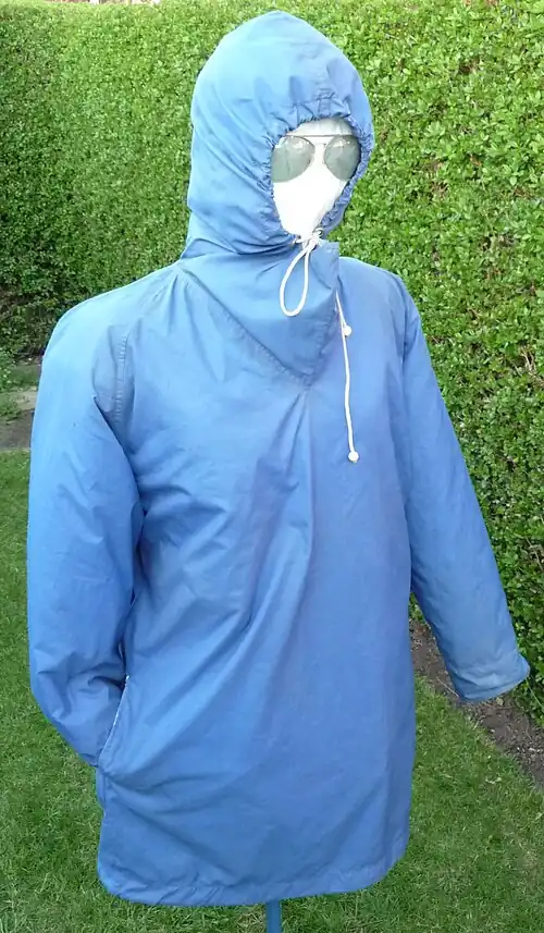 A cagoule (French: [kaɡul], also spelled cagoul, kagoule or kagool), is the British English term for a lightweight weatherproof raincoat or anorak with a hood (usually without lining), which often comes in knee-length form.[1] The Canadian English equivalent is windbreaker. The word cagoule is borrowed from the French for balaclava or hood.