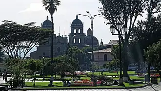 Cajamarca (Spanish pronunciation: [kaxaˈmaɾka]), also known by the Quechua name, Kashamarka, is the capital and largest city of the Cajamarca Region as well as an important cultural and commercial center in the northern Andes. It is located in the northern highlands of Peru at approximately 2,750 m (8,900 ft) above sea level[2] in the valley of the Mashcon river.[3] Cajamarca had an estimated population of about 226,031 inhabitants in 2015, making it the 13th largest city in Peru.[1]