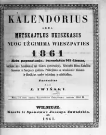 With the help of Ireneusz Kleofas Ogiński,[10] Ivinskis attempted to get permissions to publish his calendar for 1872 and a prayer book in Lithuanian.[11] The calendar was printed but then confiscated; Ivinskis demanded 3,000 rubles from the authorities to compensate for his losses.[10] Ivinskis and other Lithuanian activists managed to get permissions to publish the 1878 calendar in Latin alphabet in Saint Petersburg.[12] 1,200 copies of this calendar were printed.[13] Further efforts of publishing the calendar in Russia were rejected, including 1879 and 1880 calendars.[14] Therefore, in total, Ivinskis published 21 issues of his calendar in Russia (1846–1852, 1855–1867, 1878).[15]