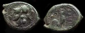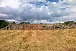The Romans captured it in 335 BC and established a colony with Latin rights of 2,500 citizens. Cales was initially the centre of the Roman dominion in Campania. To the period after 335 belong numerous silver and bronze coins with the inscription Caleno. It was an important base in the war against Hannibal, and at last refused further contributions for the war. Before 184 BC more settlers were sent there. After the Social War it became a municipium. The fertility of its territory and its manufacture of black glazed pottery, which was even exported to Etruria, made it prosperous. At the end of the 3rd century BC it appears as a colony, and in the 5th century (AD) it became an episcopal see, which (jointly with Tano since 1818) it still is, though it is now a mere village. The cathedral, of the 12th century, has a carved portal and three apses decorated with small arches and pilasters, and contains a fine pulpit and episcopal throne in marble mosaic. Near it are two grottos, which have been used for Christian worship and contain frescoes of the 10th and 11th centuries.[1] Inscriptions name six gates of the town: and there are considerable remains of antiquity, especially of an amphitheatre and theatre, of a supposed temple, and other edifices.[2]