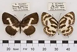 Female. Similar to the male on both upper and under sides, but on the former the white medial band is narrower, on the latter the black markings are broader. Antennae, head, thorax and abdomen as in the male.[4]