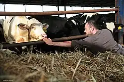 Calf 269 is a bull who was rescued as a calf by anonymous activists, days before his planned slaughter. He was born at an Israeli facility in the vicinity of Azor, a town on the outskirts of Tel Aviv. The slaughter was scheduled for June 2013.[1] He is described as sweet-tempered and white-headed, and his ear carried a tag numbered 269, indicating he was destined for slaughter.[2] The Israeli protests regarding the calf were followed by protests in the U.K. and other places across the world. The protests aimed at conveying that animal parts eaten as food by humans once belonged to a living individual, who lived a tortured life and faced a brutal death, after which his or her carcass was processed into human food.[3] The significance of the event led to the creation of 269 life, an animal liberation movement founded in October 2012.[4]