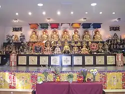 In 2010, the Pai Yuin Temple renovated and expanded their premises, which increased the size of the main hall and shrine. In August 2012, Grandmaster Sheng-yen Lu visited the temple to perform the consecration ceremony. The Pai Yuin Temple's shrine include an eclectic mix of Buddhist statuettes with varying Chinese, Tibetan, and Japanese (Shingon) styles. Notable statues include a lifelike statue of Sheng-yen Lu (used to enhance visualization for the practice of Guru Yoga), Bodhidharma (the founder of Zen Buddhism), Yamantaka, Acala, Guanyin (Sanskrit: Avalokitesvara), Amitabha Buddha, Maha Mayuri (Peacock King), and Ragaraja. The main shrine is flanked by subsidiary shrines that include the protectors of the Chinese animal horoscopes, the local earth god (Tudigong), as well as popular Hindu deities, including Ganesh, Prithvi, and Brahma. The Hindu deities are a popular focal point for enrichment or worldly practices. On the lower floor of the temple, there is a traditional Chinese Ancestral shrine (known as the Ksitigarbha Bodhisattva Hall). In the ancestral shrine, family members or friends may sponsor the names of their deceased loved ones, which are inscribed on plaques as a memorial.