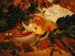 Among their most famous invention was "Jewish pizza", a pizza dough first cooked then topped with smoked salmon, crème fraîche, capers, and dill.[10] Another innovation was using infused olive oil, baby vegetables, chili oil, and flavored dough.[4]