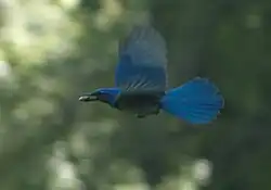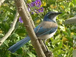 The California scrub jay (Aphelocoma californica) is a species of scrub jay native to western North America. It ranges from southern British Columbia throughout California and western Nevada near Reno to west of the Sierra Nevada. The California scrub jay was once lumped with Woodhouse's scrub jay and collectively called the western scrub jay. The group was also lumped with the island scrub jay and the Florida scrub jay; the taxon was then called simply scrub jay.[2] The California scrub jay is nonmigratory and can be found in urban areas, where it can become tame and will come to bird feeders. While many refer to scrub jays as "blue jays", the blue jay is a different species of bird entirely.