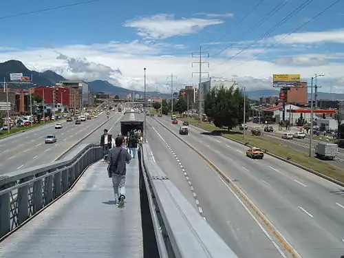 The simple-station Calle 100 is part of the TransMilenio mass-transit system of Bogotá, Colombia, which opened in the year 2000.