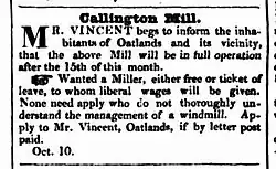 - “THE Callington Mill, in the township of Oatlands, considered one of the first rate windmills in the country, and surpassed by none in its situation for business. Fitted up with two pair of good stones, (French burrs,) dressing and smut machines; together with a very respectable dwelling house, attached to which is a counting house and small store, washhouse and servants' bedroom. On the premises is a good granary, stable, chaise and cart houses, with piggeries and fowl house, and about two acres of garden ground in cultivation.