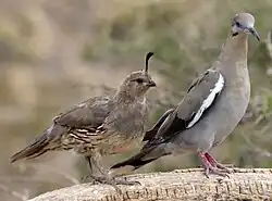 Gambel's quail (Callipepla gambelii) is a small ground-dwelling bird in the New World quail family. It inhabits the desert regions of Arizona, California, Colorado, New Mexico, Nevada, Utah, Texas, and Sonora; also New Mexico-border Chihuahua and the Colorado River region of Baja California. Gambel's quail is named in honor of William Gambel, a 19th-century naturalist and explorer of the Southwestern United States.