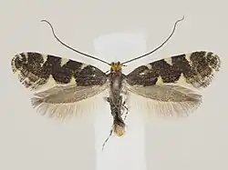 The wingspan is about 11 mm.The head is orange brown. The forewing has evenly brown ground colour. There are three white triangular striae at the costa and 2 small striae near the apex. The inner margin has a white dot at the base and two triangular striae, one in the middle of the inner margin, the other at 2/3.[1][2]
