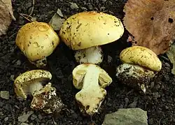 The stipe measures 4-6 x .8-1.5 cm and has a marginate bulb at its bottom that is up to 3 cm wide. It has a universal veil that can vary in prominence, and is yellow when young, later turning brown, and slightly sticky. The stipe has a white, abundant cortina.[4]