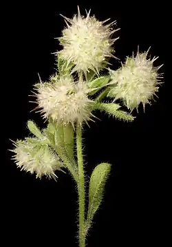 It has no basal leaves; the aerial leaves are somewhat wedge-shaped, 0.5 to 2 centimetres (0.20 to 0.79 in) long and 1 to 7 millimetres (0.039 to 0.276 in) wide. The barbed flower heads range from 4 to 10 millimetres (0.16 to 0.39 in) in diameter, supported by bracts that encase a conical, scaled receptacle. The florets are yellow and sprout to be 1 mm long.[4]