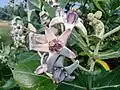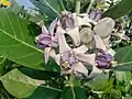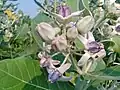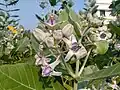 This plant plays host to a variety of insects and butterflies. It is the host plant for Hawaii's non-migratory monarch butterflies.[4] Calotropis is an example of entomophily pollination (pollination by insects) and pollination is achieved with the help of bees. In Calotropis, gynostegium is present (formed by the fusion of stigma and androecium). The pollen are in a structure named pollinia which is attached to a glandular, adhesive disc at the stigmatic angle (translator mechanism). These sticky discs get attached to the legs of visiting bees that pull out pollinia when a bee moves away. When such a bee visits another flower, this flower might be pollinated by the pollinium.