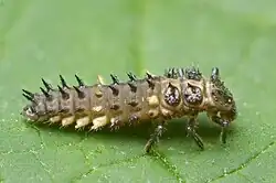The larvae are black with white markings. They have six legs and several blunt conical spines on each segment of the abdomen, similar to larvae of Cycloneda but with shorter legs.[1]