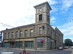 Camborne's parish church is dedicated to St Martin and St Meriadoc: it is entirely of granite, of 15th century date, but incorporating earlier structural features, including a Norman chevron stone in the west wall of the north aisle found in 2009 and is listed Grade I. St Martin was added to the original dedication to St Meriadoc in the 15th century. There is a western tower about 60 feet high containing eight bells (with a clock before 1882) and the aisles are identical in design: the building was gutted and restored in 1861-62 and an outer south aisle was added in 1878–79 to a design by James Piers St Aubyn.[38] The church was re-opened on 7 August 1879 by Edward Benson, the Bishop of Truro.[39]