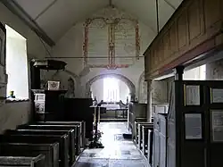 The parish church is dedicated to St. James and dates from the late 12th century. The tower, probably from the 15th century with 19th-century restoration, is built of red Mendip stone which contrasts with the local blue lias limestone of the rest of the church. The tower contains a bell dating from 1779 and made by William Bilbie of the Bilbie family.[9] There are fragments of wall paintings on the nave north and south walls. Fragments from the 12th to the 17th century have been identified, the most impressive being the fine early-17th-century Ten Commandments over the chancel arch, framed in twining leaves with cherubs' faces peering out. These remained hidden behind whitewash until the 1960s leading John Betjeman to describe it as "Rip Van Winkle's Church".[10] The west gallery is dated 1711 but with Jacobean style balusters and attached Charles I coat of arms. The south gallery is dated 1819. There are two early-19th-century monuments on the north wall of the nave to the Rees-Mogg family of Cholwell House within the parish, and a brass plaque commemorating the nine people from the village who died in World War I.[11] The church is surrounded by trees. It is a Grade I listed building[12] Several of the monuments in the churchyard are Grade II listed.[13][14]