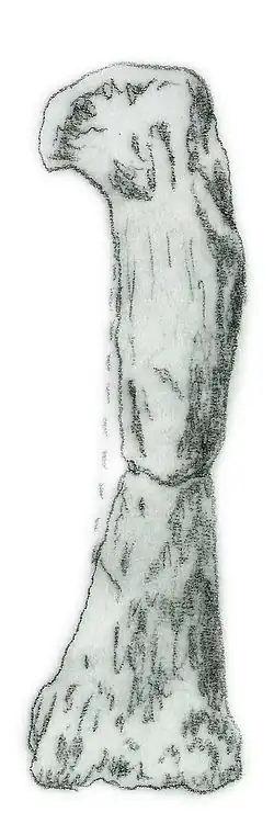 From the fragmentary remains of Camelotia, part of the skeleton can be reconstructed. Camelotia likely had a short neck supporting a fairly large skull with small eyes. Its jaws contained many small-to-medium-sized, serrated, leaf-shaped teeth.[7] Its hands and feet had five digits each; the hands in particular were long and narrow, and bore a large claw.[7] The forelimbs were longer than the hind limbs, in contrast to the more derived sauropods.[7] It has been calculated around 10 metres (33 ft) long and to have weighed up to 2.5–3.8 metric tons (2.8–4.2 short tons).[8][9]
