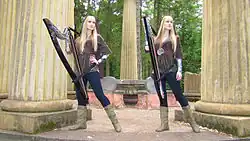 Bailey Johnson, writing at the CBS News "Feed Blog", described their arrangement of The Cranberries' "Zombie" as "elegant, wistful and an excellent tribute".[10] Huffington Post arts reporter Mallika Rao said of their Game of Thrones theme arrangement: "Yes, there have been other attempts to cover Ramin Djawadi's haunting tune before, but this one is now the only one."[11] Megan Bledsoe, in her Doctorate of Musical Arts in Harp Performance dissertation[12] remarks that while groups like Harptallica and the Harp Twins provide a new perspective on previous instrumentation choices within these genres, "the resulting sound of these ensembles, which very closely resembles any harp duet throughout history ... ultimately perpetuates the angelic, calm, feminine stereotypes of the instrument."[8] United Kingdom-based heavy metal music magazine Metal Hammer has an alternative assessment of the Harp Twins. In a "Hot New Band" feature on the Harp Twins entitled "Harp Attack", Metal Hammer remarks: "Rather than turn their attention to obvious, classically grounded territory, The Harp Twins have made a name for themselves covering the likes of Iron Maiden, offering classics like Fear of the Dark a fascinating new lease on life."[13] Ahead of a concert tour in the summer of 2022, they started work with a set of death metal performers, the Volfgang Twins, moving increasingly into a binary light-dark alignment.