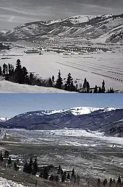 By 1943, Camp Hale had as many as 14,000 men in training.[8] Conditions in the camp were harsh: the altitude required acclimation and the shallow valley created polluted inversion layers, as the primary energy source was coal. Recreation (outside of skiing) was non-existent because of the camp's high mountain isolation, which prevented even the USO from visiting, and many of the non-skiing trainees hated skiing.[13] Trainees were taught to ski at Cooper Hill by ski instructors, brought from the ski-areas such as Sun Valley and Waterville Valley.[8] Located three miles (5 km) south of the camp, Cooper Hill had on-site barracks for the instructors and a newly built T-bar lift for the trainees.[15]