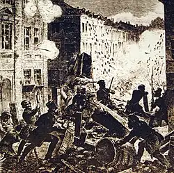 This eventually led to gunfire. Exactly what provoked the shooting remains unclear, but the most common explanation is that a drunkard stumbled into the path of Lyon's marching soldiers and fired a pistol into their ranks, fatally wounding Captain Constantin Blandowski of the 3rd Missouri Volunteer Infantry.[a] The Volunteers, in reaction, fired over the heads of the crowd, and then into the crowd. Some 28 civilians were killed, including women and children; more than 75 were wounded.[7]
