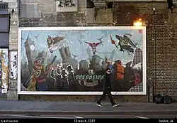 - Red fliers are handed out at a concert in Paris, France with the words "Art is Resistance," leading to http://artisresistance.com