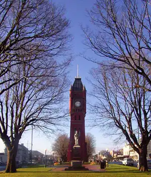 The town is known for its classic historical buildings. The most notable is the 103-foot (31 m) high Gothic Manifold Clock Tower, built in 1897, which sits in a wide Elm lined median between the dual carriageways of Manifold Street, named in honour of one of the pioneer pastoralists. The Tower, avenue, Boer War memorial, Soldiers' memorial, memorial cross and JC Manifold statue are all listed on the Victorian Heritage Register.