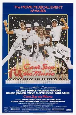 Can't Stop the Music is a 1980 American musical comedy film directed by Nancy Walker in her only directed featured film. Written by Allan Carr and Bronté Woodard, the film is a pseudo-biography of the 1970s disco group the Village People loosely based on the actual story of how the group formed. The film also stars Valerie Perrine, Caitlyn Jenner[a] in her film debut, Steve Guttenberg, Paul Sand, Tammy Grimes, June Havoc, Barbara Rush, Altovise Davis, Marilyn Sokol and The Ritchie Family in their only film.