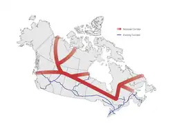 During the 2019 Canadian federal election, Andrew Scheer's Conservative Party platform included establishing a "National Energy Corridor".[1] During the 2025 election, Pierre Poilievre's Conservative Party revived the idea of a "National Energy Corridor", and Mark Carney's governing Liberal Party budgetted $5 billion for a Trade Diversification Corridor Fund.[2]