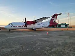 A Canadian North ATR 42-500 aircraft overnighting at Cambridge Bay Airport, July 2021
