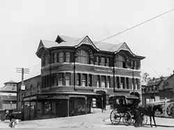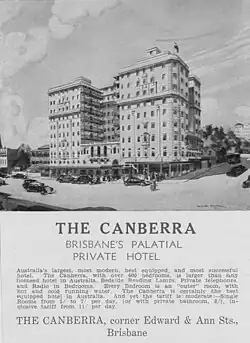 The Canberra Hotel was built by the Queensland Prohibition League (later the Queensland Temperance League). The foundation stone was laid on Saturday 30 July 1927 by the Lord Mayor of Brisbane William Jolly with the intention to build a 5-storey building at a cost of £95,000; coins found buried under the foundation stone of the old Temperance Hall were reburied under the Canberra's foundation stone along with current newspapers and documents relating to the affairs of the Queensland Prohibition League. The architect was Arnold Edwin Brooks. The building was financed by private benefactors, particularly William Robert Black and George Marchant, and through a low-interest loan from the Independent Order of Rechabites (a friendly society committed to temperance).[1][2][5] There was ill-feeling that Black and Marchant were levied for gift tax by the Queensland Government in relation to their donations, but in July 1929 as the building neared completion, an act of parliament was passed to exempt these donations from gift tax.[6]
