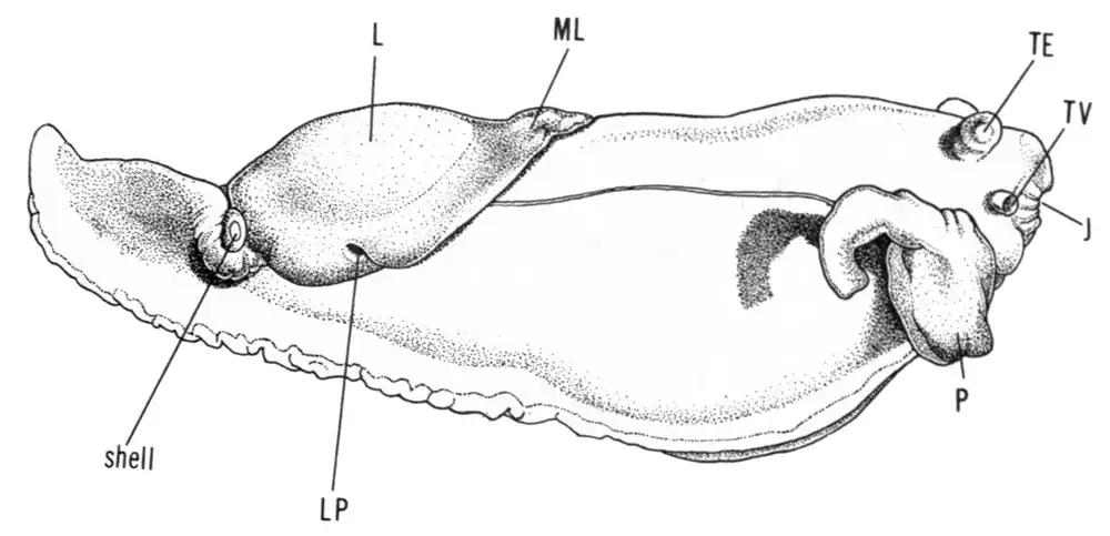 | Drawing of lateral view of preserved specimen of Candaharia rutellum | |