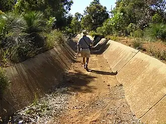 The Canning Contour Channel is a 16-kilometre (9.9 mi) series of human-made concrete channels and steel and cast-iron pipelines in the Darling Scarp in Western Australia constructed between July 1935 and December 1936.[1] The project was a Depression era public works scheme to carry potable water from just below Canning Dam through the hills around and above Roleystone and Kelmscott to a screening, fluoridation and pumping station near Gosnells by following the natural contours of the Canning Valley – hence it was entirely gravity-fed. Where a tributary valley needed to be crossed, suspended or siphoning pipelines were used. From Gosnells, the water entered the city's pipeline distribution system.