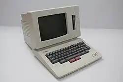 The hardware consists of a 9-inch (229 mm) black-and-white monitor (80 x 24 character display, 672 x 344 resolution),[6] a single 3½-inch 256 KB floppy disk drive, and an IBM Selectric–compatible keyboard. It uses a Motorola 68000 CPU (like the Macintosh) running at 5 MHz, has 256 KB of RAM, and an internal 300/1200 bit/s modem. Setup and user preference data are stored in 8 KB of non-volatile RAM with battery backup. The array of I/O interfaces encompasses one Centronics parallel port, one RS-232C serial port (DB-25), and two RJ11 telephone jacks for the modem loop. The total weight is 17 pounds (7.7 kg).