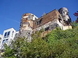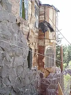 Sidney Lynne and John Hefferin purchased the house for $469,900 in 2004 after it had been unoccupied for more than a year. By then, the structure had developed leaks and displayed cracks along the foundation, walls and ceiling. In 2006, a falling tree caused stones to break away, damaging the house's main gas line.[3][5] The couple spent $200,000 over four years to reinforce the walls. Lynne and Hefferin also constructed exterior stairs and an underground retaining wall. However, the renovation process was not completed, as they were unable to pay for all repairs required by the city, which had issued $20,000 in fines on the property. The couple also struggled to pay for costly landslide prevention efforts, rising property taxes and high heating bills.[5] Canterbury Castle was listed for sale in the summer of 2008 for $2 million. Lynne invited local interior design students and contractors to upgrade the house's interior, without success.[3] The couple left the house in January 2009, and ownership was turned over to JPMorgan Chase.[3][5] Lynne began a "one-woman crusade" to save the castle, seeking assistance from Portland City Commissioner Randy Leonard and from home improvement expert and This Old House host Bob Vila.[5] In February 2009, the city's bureau of development services found that unstable soil and the risk of stones separating from sheeting underneath posed a landslide risk. The property had missing stones and thick cracks several feet long, which presented hazards to residents and the street below. Rumors of demolition began to surface in March 2009.[5]