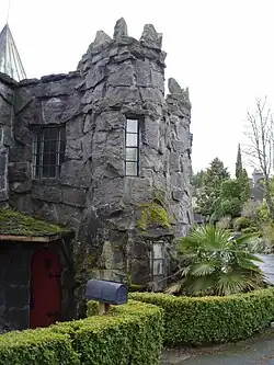 Canterbury Castle was a private 6,000-square-foot (560 m2), three-story house located in Arlington Heights near Washington Park, offering views of downtown Portland. Constructed from basalt stone quarried from Rocky Butte,[3][4] the house featured characteristics of a castle such as a moat, a drawbridge and a copper-topped turret.[3][5] The wooden drawbridge covered a moat seven feet wide by more than three feet deep. A single-car garage, built into the hillside, was constructed during the same time as the house. The concrete foundation supported a rectangular ground plan. Canterbury featured "buttressing wing walls, cylindrical corner bays and a crenellated parapet of uncut stone".[2] Round, arched and straight-topped frameless windows were often fitted with steel sashes. Doorways were also frameless, narrow and round or parabolic in shape. Doors had wrought iron hinges, handles and lock plates. The leaded glass slit window at the stair tower's top level featured a spiderweb pattern, a signature element of castle designer Jeter O. Frye's work.[2] Windmill palms surrounding the property added to its exotic appearance.[5]