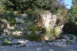 The design and creation of this new garden was the fruit of the close collaboration between the architect, Alphonse Laverrière, the professor Florian Cosandey, and the gardener, Charles Lardet. The plan for this new site included alpine rock gardens and a pool dominated by a cliff made of strata of rock and a cascade falling into the basin. The stone came from the Jura Mountains above Bière but the quarrying and assembly were made more difficult than custom by the strict requirements of the job. No marks of tools or broken fragments were allowed to be seen in the finished work, which must appear natural and as if part of the original hill site.[5]