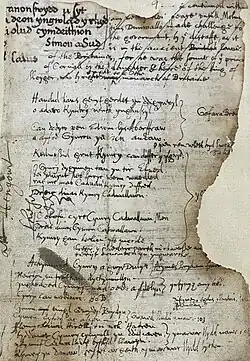 Only two folios of Hengwrt MS 120 survive, bound in a manuscript of Lewis Morris (BL Add. MS 14907).[41] However, these two pages preserve much of the material of 'Cerdd y Cor a'r Gorres', known as 'Moliant Cadwallon' by modern scholarship.[3][42] NLW MS 9094, a compilation of Vaughan's notebooks on British history, contains four and a half lines of this poem which appear in BL Add. MS 14907, six which are absent in BL Add. MS 14907, and the first five lines of 'Gofara Braint'. These lines were copied into NLW MS 9094 because he interpreted the poems as referencing 'Cymru' as a place-name, though the word might instead stand for Cymry 'the Welsh', since the two words were identical in Middle Welsh.[3][43] Two folios of this manuscript have dates of 1652 and 1658, and the latter part of the manuscript was probably written while Vaughan was working on a chronology of British history for Archbishop Ussher.[44]