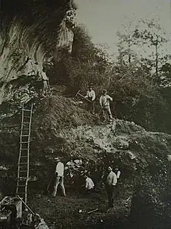 Following the discovery of the frieze, work was undertaken in 1911 to build a protective wall around the shelter. This included lowering the shelter floor, a procedure during which a workman hit a skull with a pick-axe, breaking it. A relatively complete skeleton was uncovered and Denis Peyrony and Louis Capitan were brought in to examine it.[2][3]