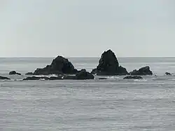 The Three Steeples and Black Reef are 28 rocky islets, rising to a bit over 20 m (66 ft) high, approximately 2 km (1.2 mi) north of Cape Foulwind.[22] They are granite rocks,[23] named by Jules Dumont d'Urville as Les Trois Cloches on 12 January 1827[24] and depicted as Three Steeples on James Wyld's 1839 map.[25] They had been known to sealers as Black Rocks since at least 1826.[26] Patrick O'Regan thought these were the rocks illustrated by Isaack Gilsemans, when Tasman first anchored in New Zealand waters on 14 December 1642.[27] The Dutch inscription beneath the drawings has been translated as the Rocky Point.[28]