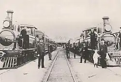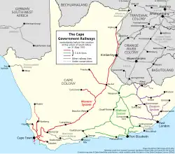 By 1885 the separate sections were connected and the Cape Western line reached Kimberley, marking the end of an epic which had begun in 1872, with the network completed faithfully according to the original 1872 plans.[17] From an initial total of 92 kilometres in 1872, the Cape was now criss-crossed with over 2,000 kilometres of railway.[18][19] In 1885 the company owned 231 locomotives, 399 coaches and 3503 goods wagons.[20]