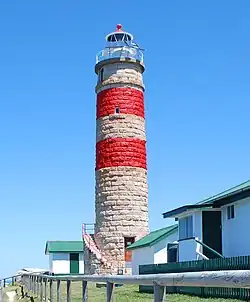 In 1937, the light was converted to 110 V DC electricity.[5] The two distinctive red bands were painted in 1942.[5] In 1967 the power source was replaced with 240 V AC power,[5] being supplied by two diesel alternators,[3] and a new lens, pedestal, bearing and optic drive may have been installed.[10] The range of the 1967 light was 27 nautical miles (50 km; 31 mi).[5] The light was modernised in July 1988,[11] with the installation of a 120 V 1 Kw tungsten halogen lamp.[3][5] In 1990, the handrails and stanchions of the balcony and external staircase were replaced and an access ladder to the dome was installed.[3] On 8 December 1993, the light was converted to solar powered operation and a VRB-25 apparatus was installed.[11]
