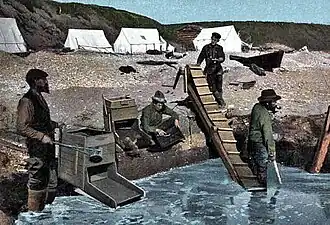 In 1899, about 1,000 miners in Nome were idle due to the fact that the entire Anvil Creek had been claimed,[4] (and presumably so had all other known placer mining sites in the area). It was fortuitously discovered that the beach at Nome was itself gold-laden, and rockers could garner $20 to $100 each day.[4]
