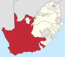 The Province of the Cape of Good Hope[2] (Afrikaans: Provinsie Kaap die Goeie Hoop), commonly referred to as the Cape Province (Afrikaans: Kaapprovinsie) and colloquially as The Cape (Afrikaans: Die Kaap), was a province in the Union of South Africa and subsequently the Republic of South Africa. It encompassed the old Cape Colony, as well as Walvis Bay, and had Cape Town as its capital. In 1994, the Cape Province was divided into the new Eastern Cape, Northern Cape and Western Cape provinces, along with part of the North West.
