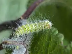 The wingspan is 18–21 mm.[2] Adults are on wing from May to August.[3] The forewings are dark reddish-fuscous, with a few white scales and indistinct whitish spots at 1/3 of disc and at the base of the first segment. There are two well-marked white bars on the segments. The cilia are mixed with black scales, banded with whitish. The hindwings are dark fuscous, the third segment with two subapical black scale-teeth in the upper cilia and suboblong subapical and small apical scale-teeth in the dorsal cilia, separated by whitish spots. The larva is pale greyish-green with darker green dorsal and subdorsal lines and brown spots and numerous whitish hairs.[4][5]