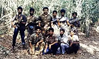 ![]() Captain Mayuran (front row, second from right) with Velupillai Prabhakaran, 1988 | |