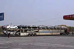 Chinese car transporter. Notice the long length and the double-parked upper deck of cars.