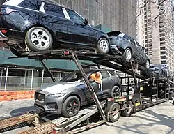 Like other semi-trailers, most commercial car carrier trailers attach to the tractor using a fifth wheel coupling. Trailers can either be enclosed, possessing walls like a conventional box trailer, which affords the shipped vehicles more protection at the cost of lower capacity; or open, as in the commonly seen skeletal tube steel design, which exposes the vehicles to the elements but allows for greater carrying capacity. An American commercial car carrier typically fits between 5 and 9 cars, depending on the car size and trailer model (capacity is limited by an 80,000 lb weight cap that a road vehicle is subject to under U.S. law.[1]). Significantly higher-capacity vehicles have been observed around the world, such as a side-by-side loading Chinese model.[2]